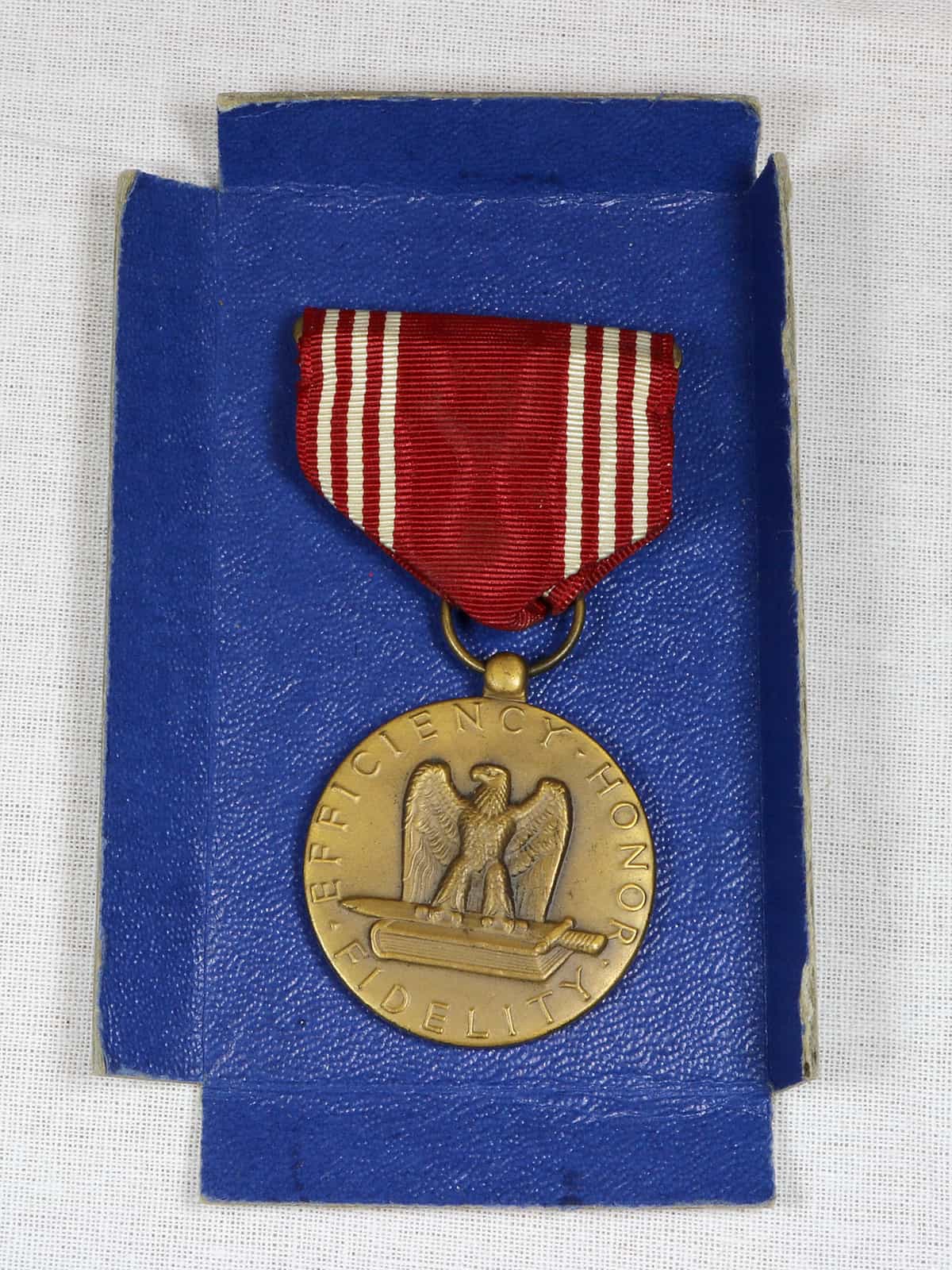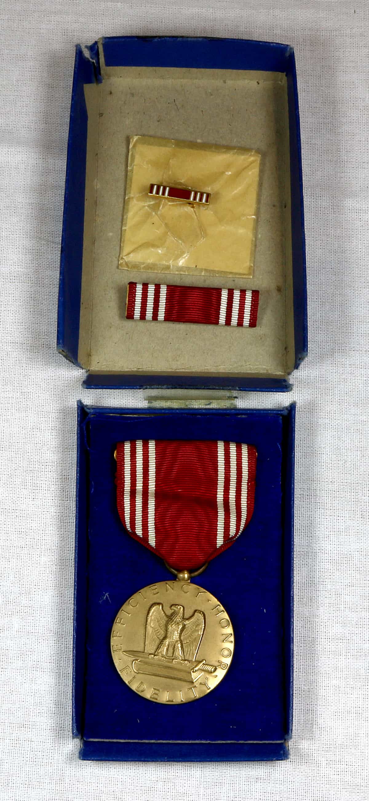 The Good Conduct Medal is one of the oldest military awards of the United States Armed Forces. The U.S. Army's variant of the Good Conduct Medal was established in 1941. Complete with blue card presentation box; red medal ribbon with white stripes. Issued to Sergeant William Schneider, 101st Airborne Division