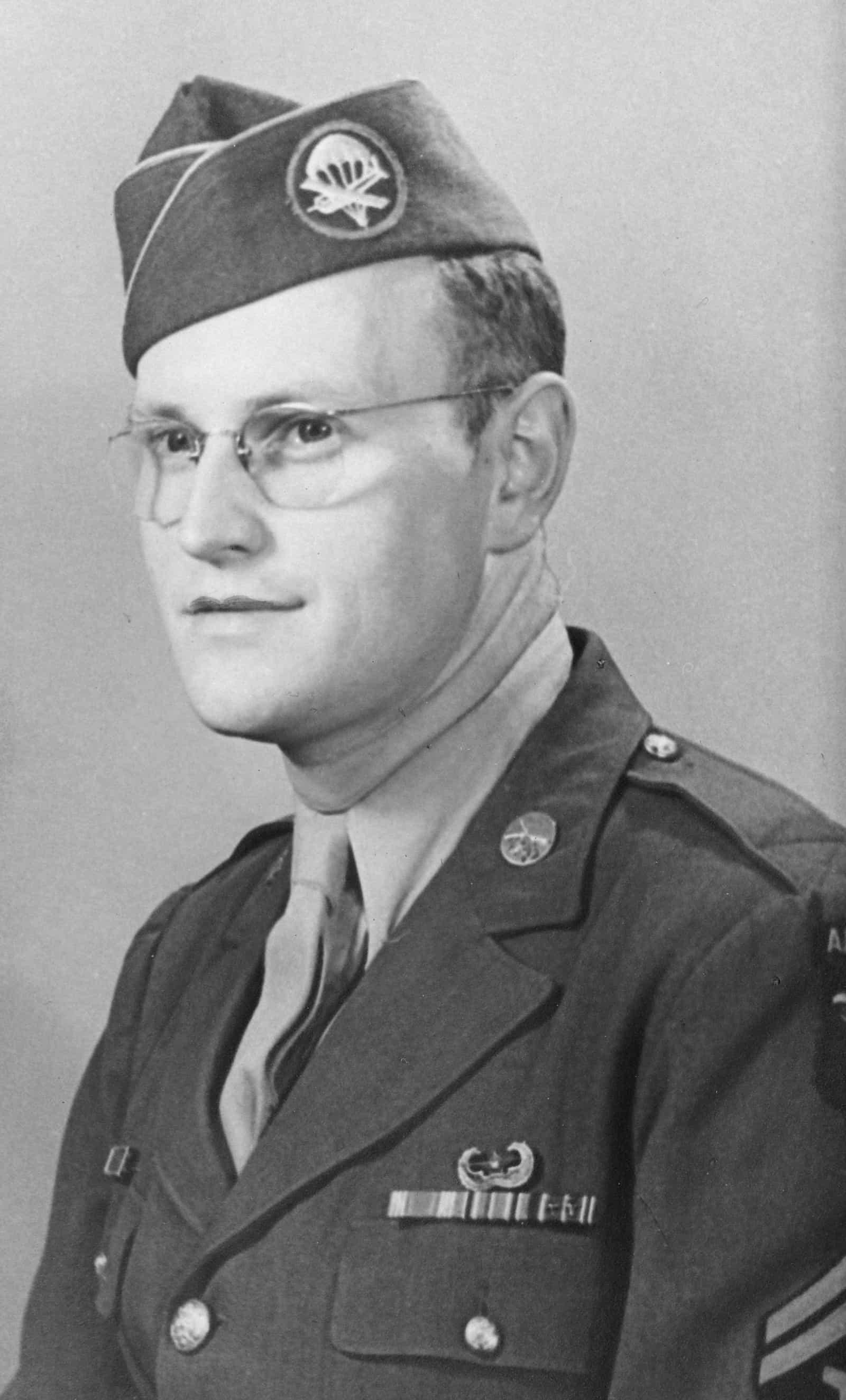 Black and white photograph of Sergeant William Schneider, who had responsibility for mail and postal services across 101st Airborne Division